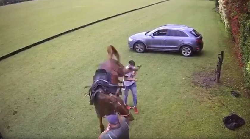 El hecho ocurrió durante un partido de Polo en Argentina, el pasado lunes 4 de noviembre, y en las imágenes de una cámara de seguridad se puede ver cómo el joven se acerca al animal, y sin hacerle nada, el caballo reaccionó con una patada, que impactó en toda la cabeza, por lo que causó el pánico de las personas que allí estaban.