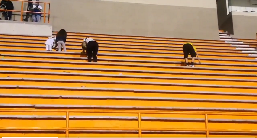 El hecho se presentó al final del partido, y en el video que circula en redes sociales se puede ver a tres menores de edad acompañados por una mujer, quienes entre todos se encargan de limpiar las graderías, recogiendo la basura en una bolsa.