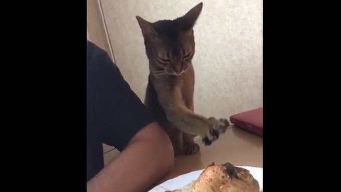 Este gatito acaricia, besa y hasta parece que le quisiera hablar a su dueño, todo para lograr convencerlo de que le comparta un pedazo de su pollo servido en la mesa.