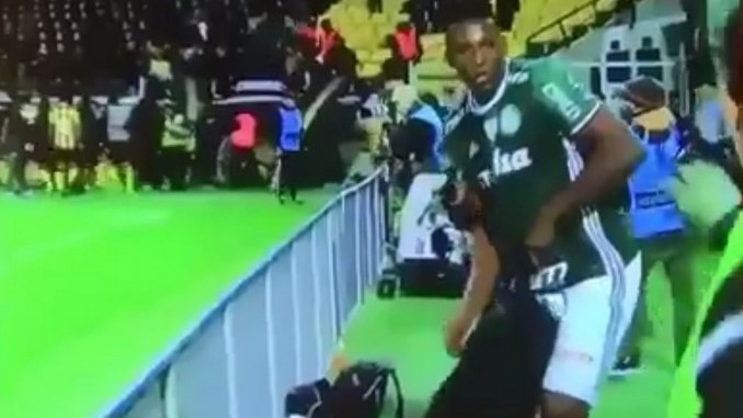 El defensor colombiano Yerry Mina, apareció en un video tomando lo que al parecer es un trípode de fotografía, en medio de la pelea que sostuvieron los jugadores de Palmeiras y Peñarol en Libertadores.