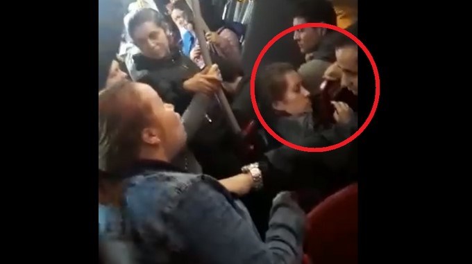 La mujer le insiste al hombre que “baje la mujer” e intenta golpearla pero él la cambia de puesto, entre golpes y gritos llegan a una estación de Transmilenio donde la mujer lo agarra de la chaqueta y vuelve a halar el cabello de la amante y se bajan.