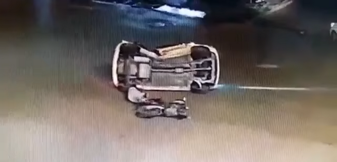 En la publicación se ve cómo la motocicleta choca con la puerta trasera derecha del taxi, con tan mala fortuna que el automotor resultó volcado, y el motociclista quedó en el suelo, sin moverse.