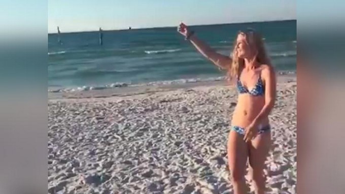 Al ver la bandada de pájaros, la mujer no dudó echarse a correr. No encontró de otra y se lanzó al agua para intentar ahuyentarlas mientras su amiga que la grababa, se reía descontroladamente.
