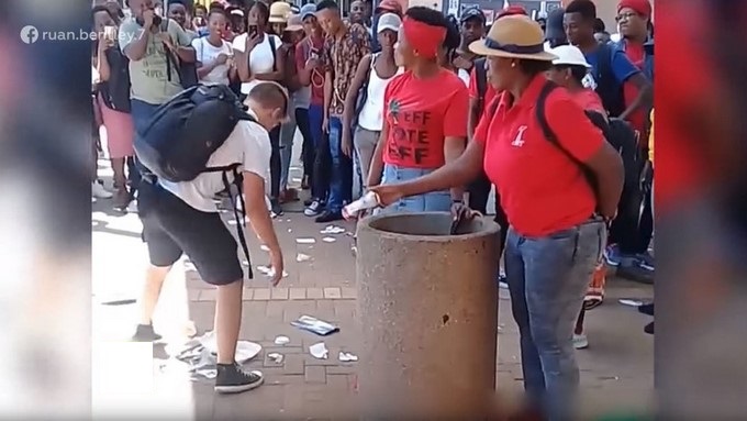 Un muchacho conocido como Eckhard Binding, estudiante de la Universidad del Estado Libre de Sudáfrica, se vio en un video que se hizo viral, recogiendo continuamente la basura de una papelera que dos integrantes del partido Luchadores por la Libertad Económica, arrojan continuamente al piso como protesta, según News24.