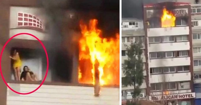 El hecho sucedió en China, donde una mujer de vestido amarillo cae al vacío cuando intentaba cruzar al edificio del lado, después de que su apartamento prendiera en llamar.