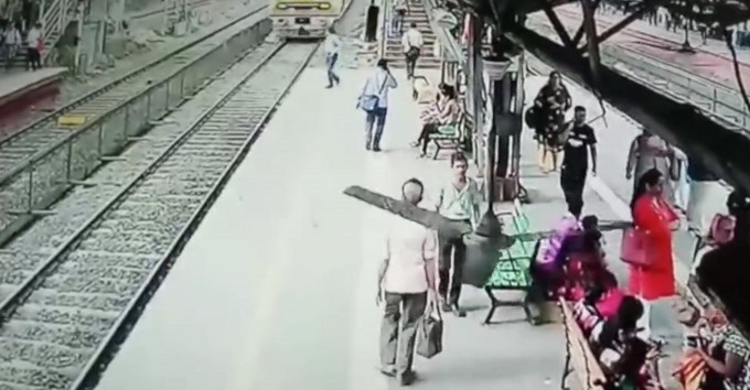 Ante la vista de los otros usuarios que se encuentran en la estación de Malad, el hombre camina hacia su muerte segura.
