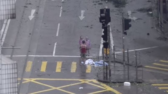 Un video publicado en YouTube muestra el momento en el que un hombre hace posar a dos menores para fotografiarlas en pleno paso del devastador tifón Mangkhut por las calles de Hong Kong.