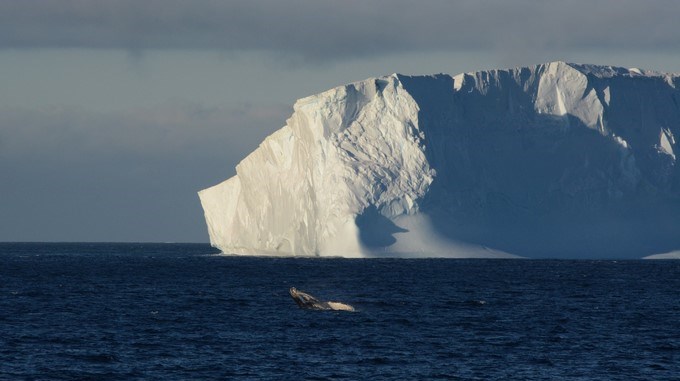 Vista de una ballena mientras salta, con un iceberg de fondo en la Antártida. EFE/Archivo