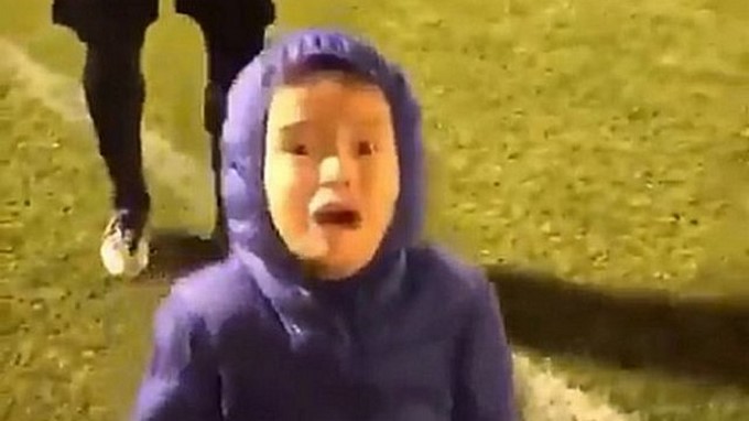 Tras no poder arrebatar el balón al jugador, el niño rompe en llanto y manda el balón lejos de él.