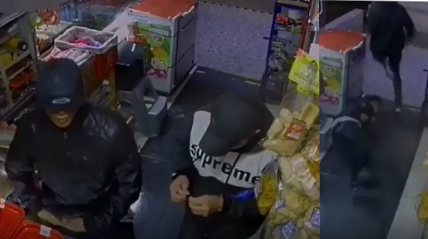 Se aprecia que en cuestión de segundos el tendero tomó un arma y disparó, impactando a uno de los sujetos cuando intentaba huir.