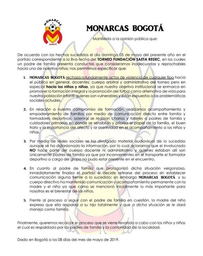 Igualmente el equipo al que pertenece el menor publicó un comunicado donde rechazaron lo sucedido y lo catalogaron como una conducta “inadecuada y reprochable” del señor.