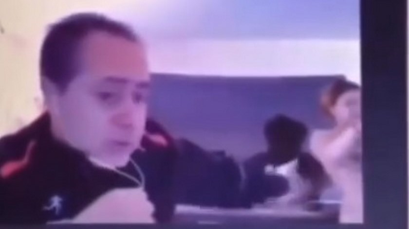 Un profesor dictaba una clase por internet cuando de repente salió su ‘esposa’ desnuda sin percatarse que el hombre estaba haciendo una videollamada, la mujer se movía de un lado para otro desnuda en la habitación mientras el preocupado docente le decía que se retirara.