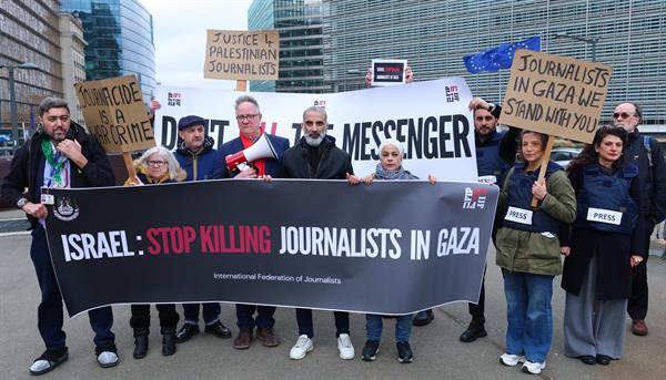 La congregación, organizada por la FIP junto con la delegación de Bruselas del Sindicato Nacional de Periodistas y el Sindicato de Periodistas Palestinos, pidió el cese inmediato de las agresiones contra los profesionales de la información, que aseguraron que se trata de “un crimen de guerra”.