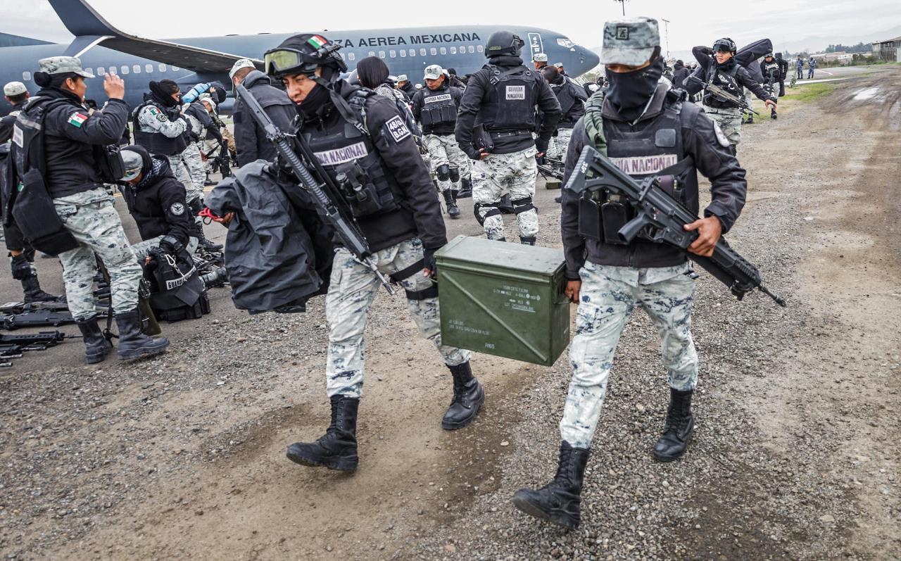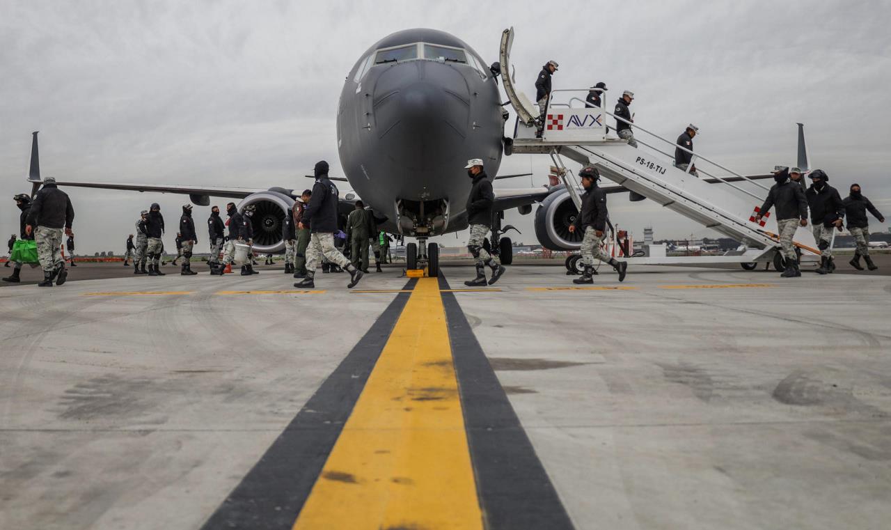 Miembros de La Guardia Nacional a su llegada hoy a la Fuerza Aérea Mexicana en Tijuana, Baja California (México). EFE/Joebeth Terriquez