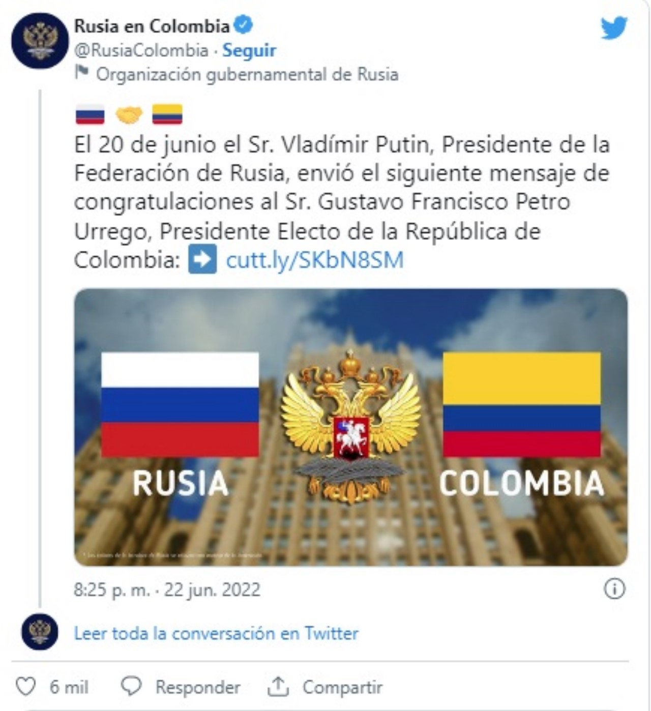 Así inicia el mensaje: “acepte mis más sinceras felicitaciones con el motivo de su elección al cargo del presidente de la República de Colombia”. Además, resaltó la relación de Rusia y Colombia diciendo que: “las relaciones ruso-colombianas tradicionalmente tienen un carácter amistoso”, además, agregó que espera que la labor de Petro sea contribuir a los lazos de unión.
