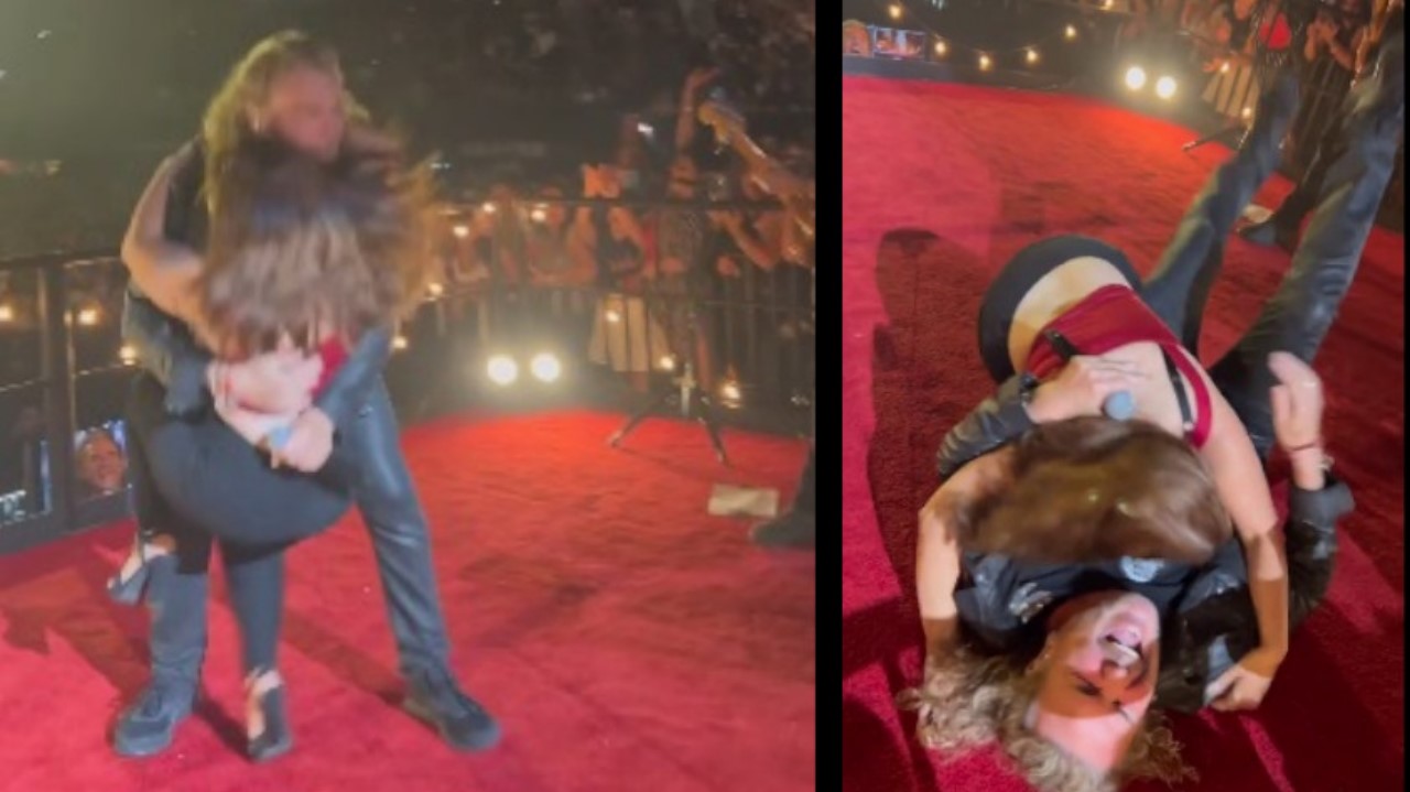 En video quedó el momento en el que el vocalista de Maná, Fher Olvera, cayó en pleno concierto tras intentar cargar una fan.