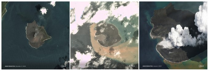 Fotografías facilitadas por Planet Labs, vistas aéreas el 17 de diciembre (i), el 30 de diciembre (c) y el 2 de Enero (d), del derrumbe de la parte occidental del volcán indonesio Anak Krakatau