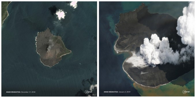 Fotografías facilitadas por Planet Labs, vistas aéreas el 17 de diciembre (i) y el 30 de diciembre, del derrumbe de la parte occidental del volcán indonesio Anak Krakatau