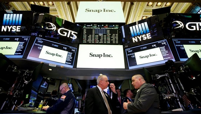 Vista del logo de Snap, la empresa matriz de Snapchat, antes de su oferta pública de venta en las pantallas de la Bolsa de Nueva York, Estados Unidos, el de marzo de 2017. EFE