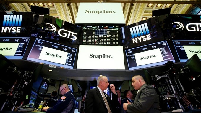 Vista del logo de Snap, la empresa matriz de Snapchat, en las pantallas de la Bolsa de Nueva York, Estados Unidos. EFE/Archivo