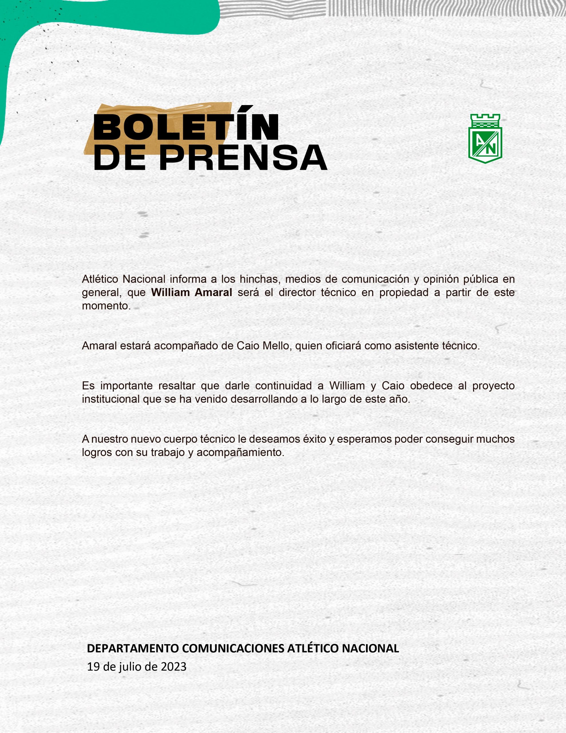 “Es importante resaltar que darle continuidad a William y Caio obedece al proyecto institucional que se ha venido desarrollando a lo largo de este año”, dijo el Atlético Nacional.