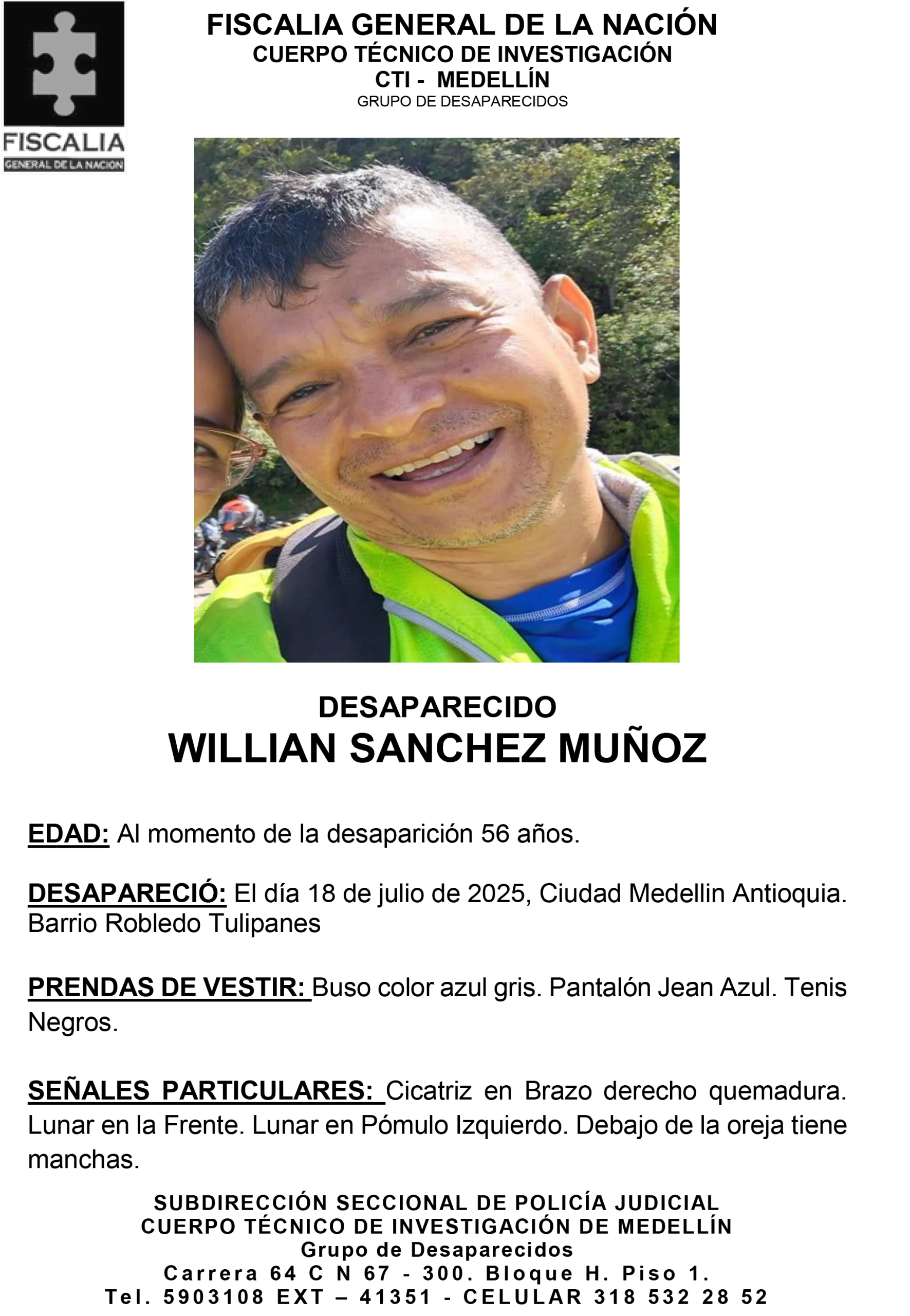 Willian Sánchez Muñoz, de 56 años, fue reportado como desaparecido el 18 de julio de 2025 en la ciudad de Medellín, específicamente en el barrio Robledo Tulipanes.