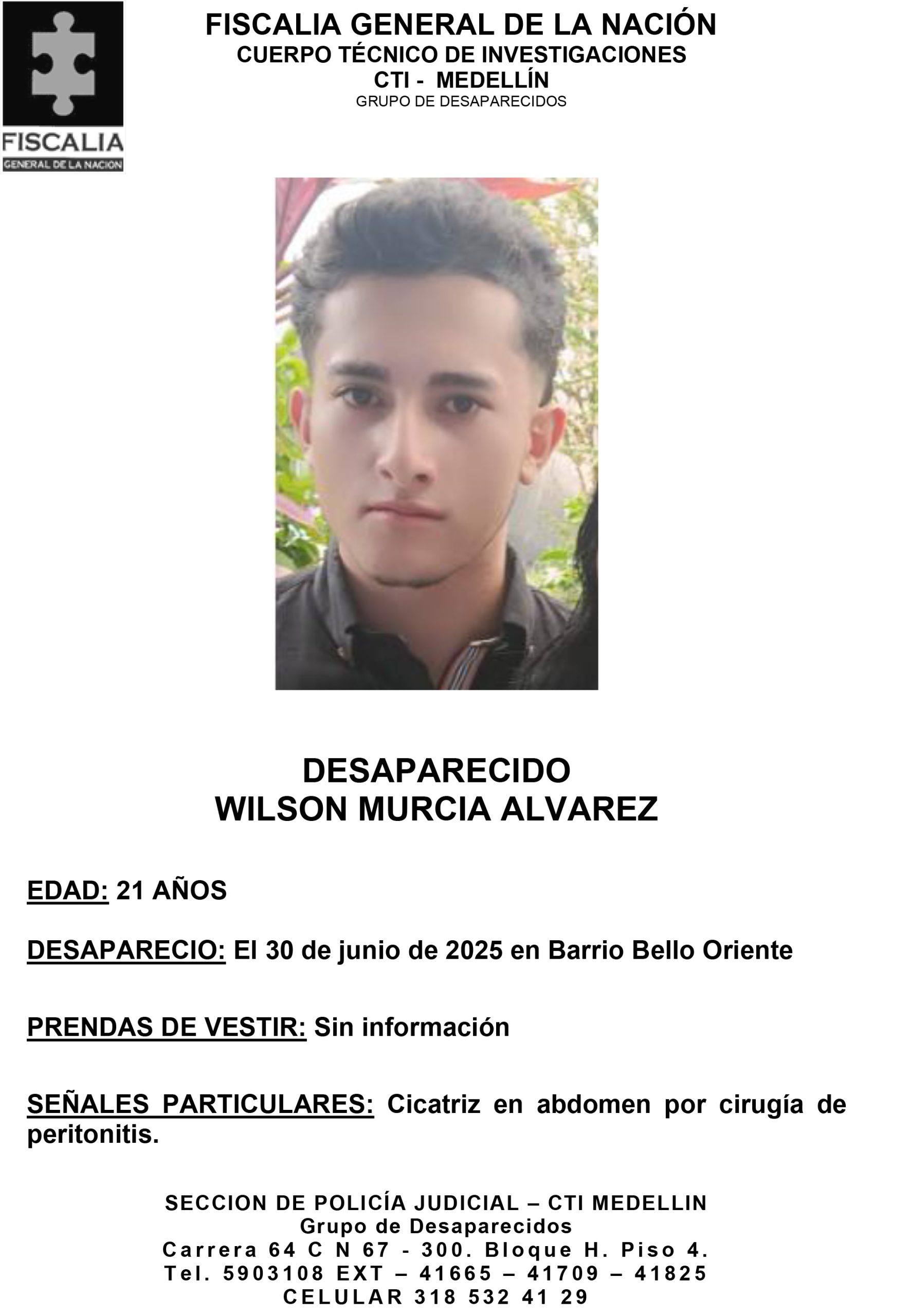 Wilson Murcia Álvarez, un joven de 21 años, fue reportado como desaparecido el 30 de junio de 2025. Su desaparición ocurrió en el barrio Bello Oriente.