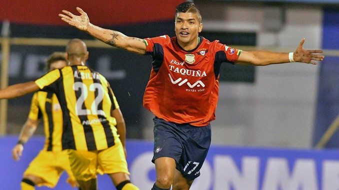 El jugador del Wilstermann Gabriel Rios festeja después de anotar un gol el 7 de marzo de 2017, durante un partido por la Copa Libertadores entre Wilstermann boliviano y el Peñarol uruguayo, en el estadio Félix Capriles de Cochabamba (Bolivia). EFE