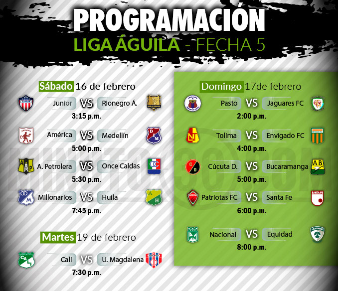 La Dimayor publicó la programación de la fecha 5 de la Liga Águila 2019-I, la cual se jugará desde el próximo sábado 16 hasta el martes 19 de febrero.