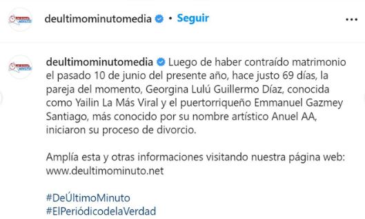 “Yailín desactivó su cuenta de Instagram, dicen por ahí, supuestamente, que sería la primera pelea, discusión, separación matrimonial entre ella y Anuel”, sostuvo inicialmente el periodista.