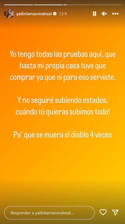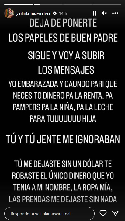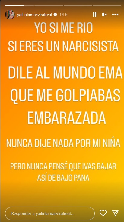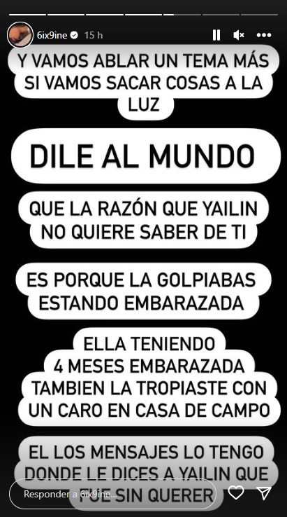 Lo que provocó que Tekashi, lo llamara “hipócrita” y escribiera por medio de Stories esto, “Dile al mundo que la razón que Yailin no quiere saber de ti, es porque la golpeabas estando embarazada, ella teniendo 4 meses embarazada también la tropiaste [atropellaste] con un carro en [una] casa de campo”.