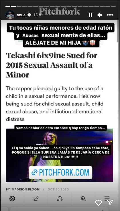 Esto hizo que Anuel enfureciera sin poder ocultarlo, y le recordó esto al rapero estadounidense, “Hasta pedófilo saliste y hasta la culpabilidad aceptas. Un ratón de verdad diciéndome rata a mí”.