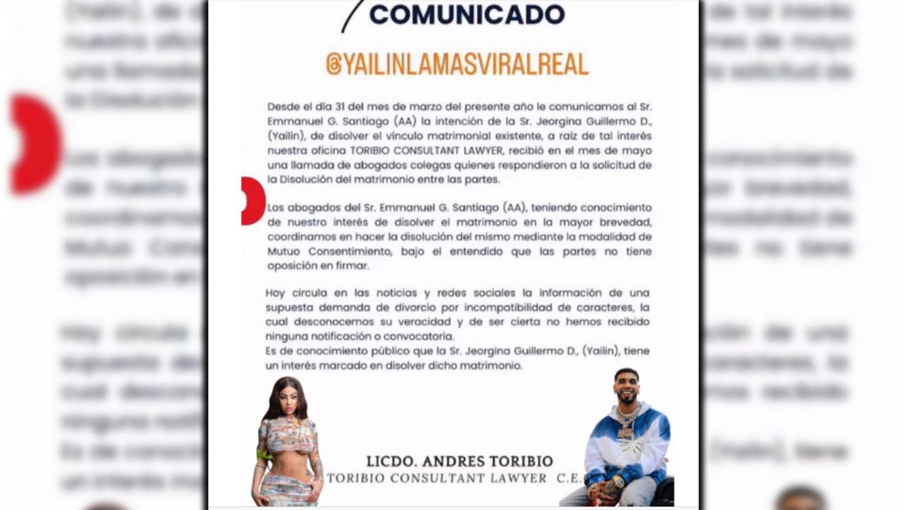 En el comunicado los abogados de la cantante señalan que “Es de conocimiento público que la señora Jorgina Guillermo (Yailin) tiene un interés marcado en disolver dicho matrimonio”.