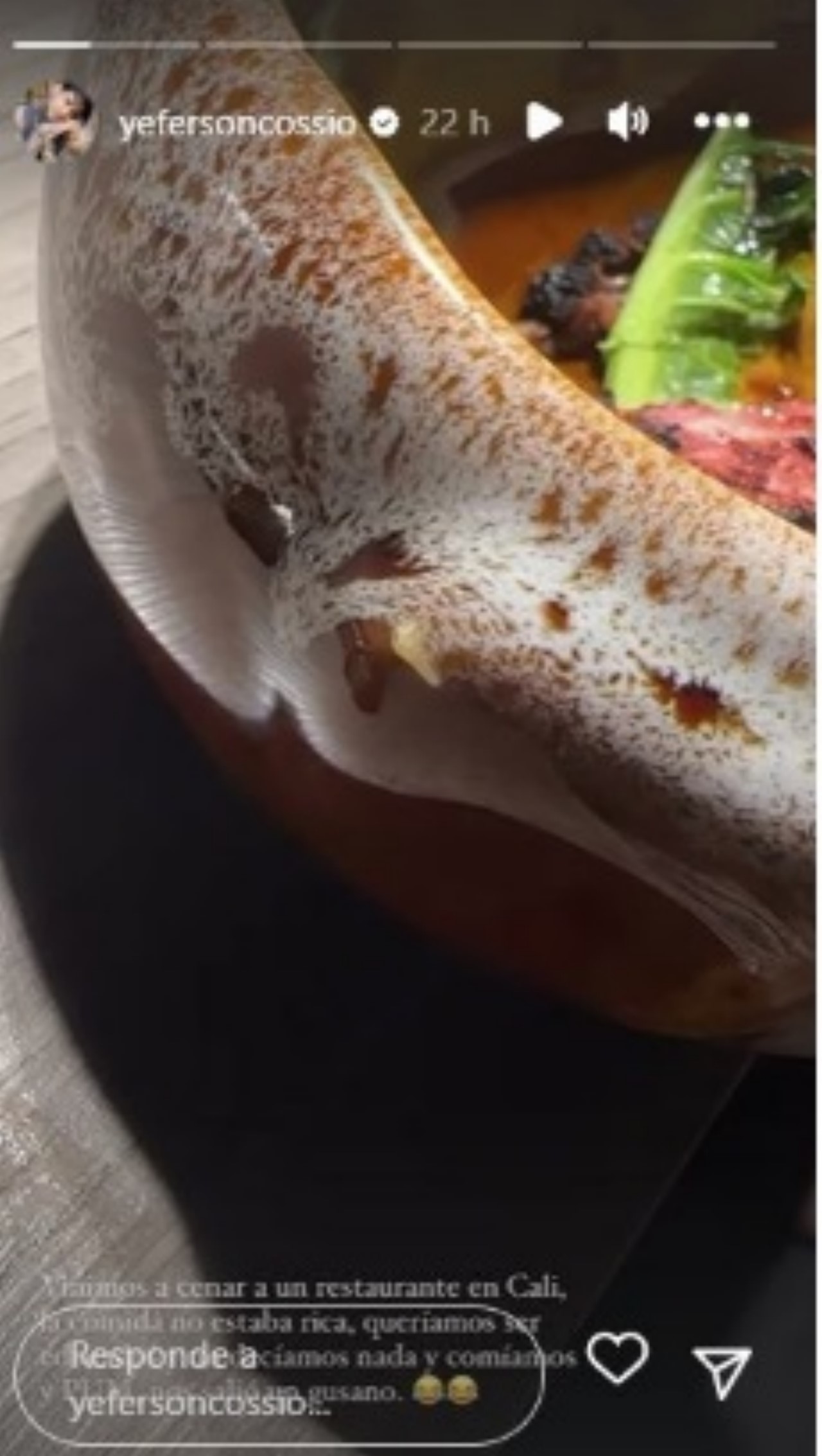 El influncer Yeferson Cossio le contó a sus seguidores el momento ‘asqueroso’ que vivió en un restaurante de Cali, al parecer le salió un gusano del plato de comida cuando estaba terminando de consumir los alimentos.