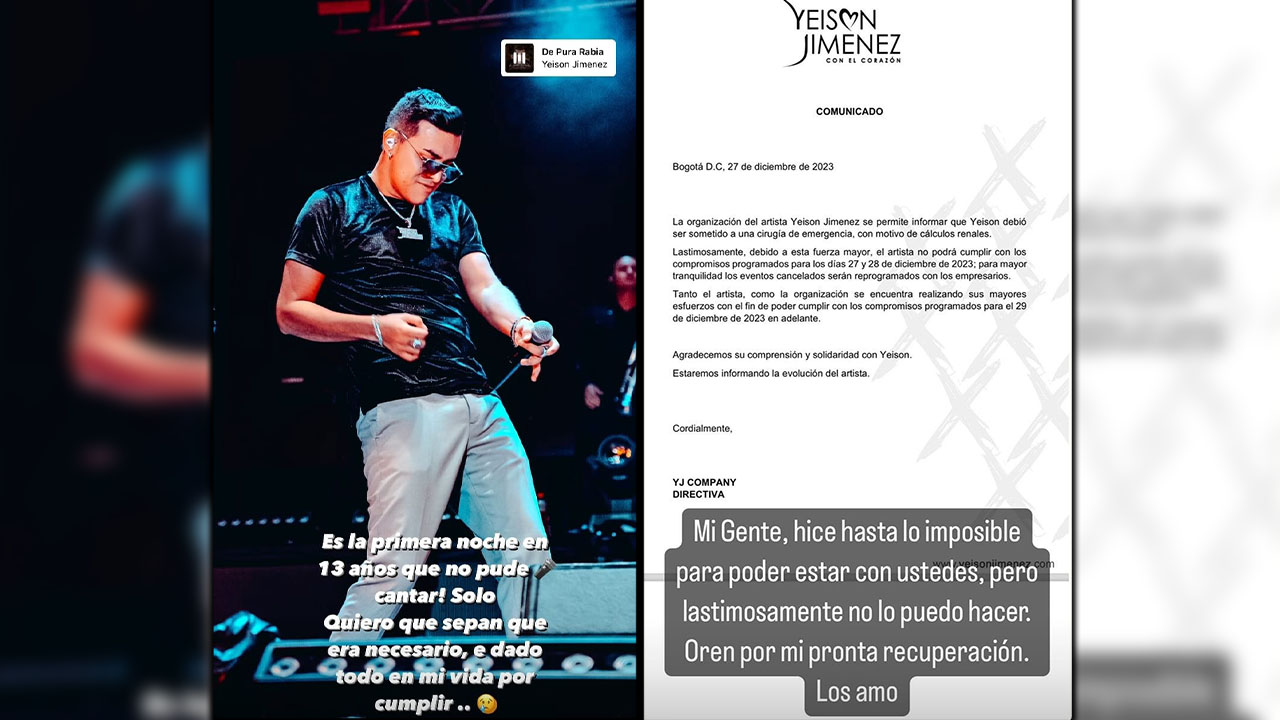 Fue desde Santo Domingo Ecuador que Yeison hizo la alerta que una complicación medica atribuida a cálculos renales lo llevarían al quirófano. “Mi gente, hice hasta lo imposible para poder estar con ustedes, pero lastimosamente no lo puedo hacer. Oren por mi pronta recuperación. Los Amo”, expresó el cantante acompañando el comunicado de su equipo que lo dejó por fuera del calendario de cierre de shows del 2023. Siguiendo con sus historias “lamentó que es la primera vez que en 13 años no pudo cantar y ha dado su vida siempre para cumplir sus compromisos”. El comunicado fechado este 27 de diciembre, lamenta por parte de la organización “YJ Company” la cancelación del dos fechas, los cuales serán reprogramados. “Tanto el artista, como la organización se encuentran realizando sus mayores esfuerzos con el fin de poder cumplir con los compromisos para el viernes 29 de diciembre 2023 en adelante”.