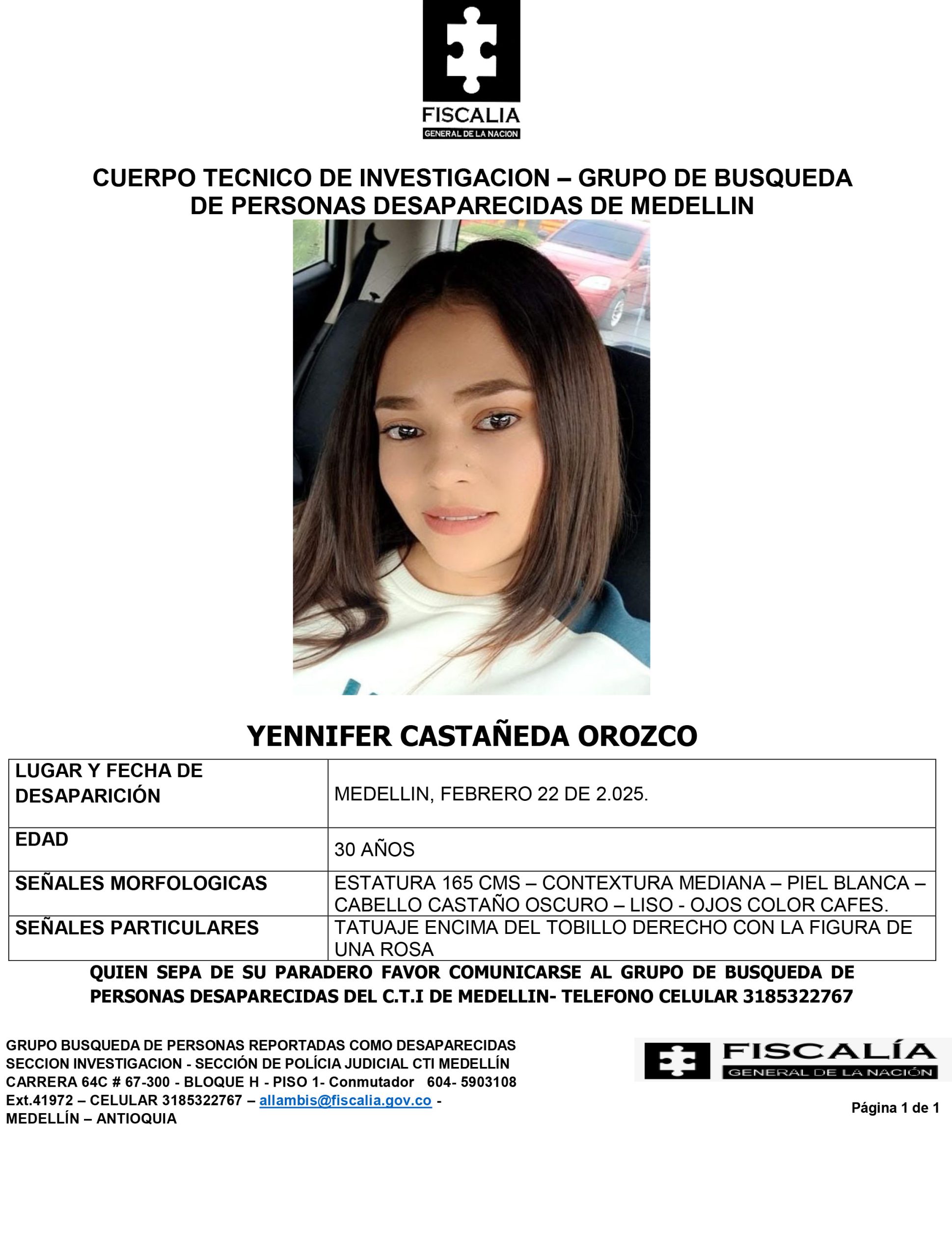 Resumen: Yennifer Castañeda Orozco desapareció en Medellín el 22 de febrero de 2025