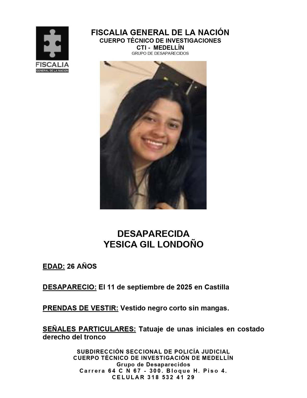Si tienes alguna información que ayude a encontrarla, por favor comunícate con el Grupo de Desaparecidos del CTI al celular 3185324129.