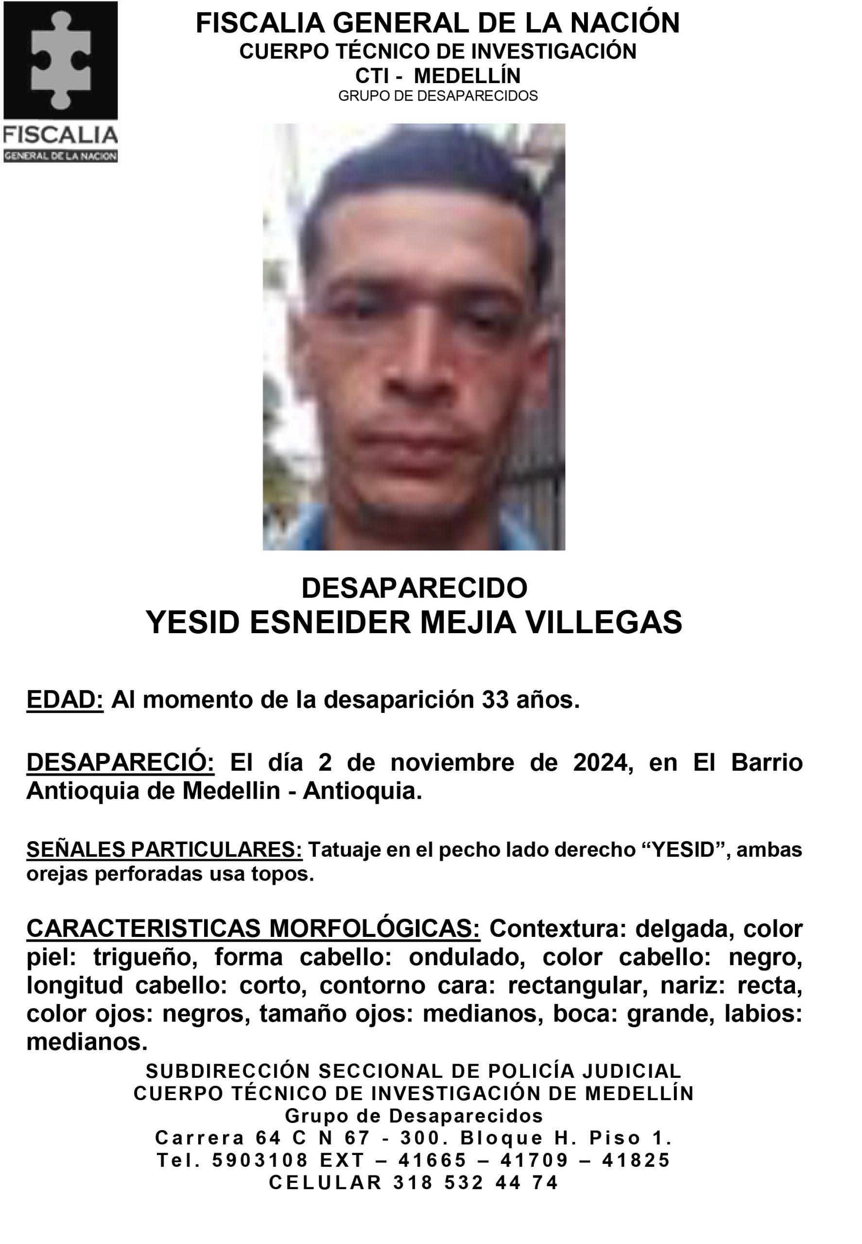 Resumen: Yesid Esneider Mejía Villegas, de 33 años, desapareció el 2 de noviembre de 2024 en el Barrio Antioquia de Medellín, Antioquia.