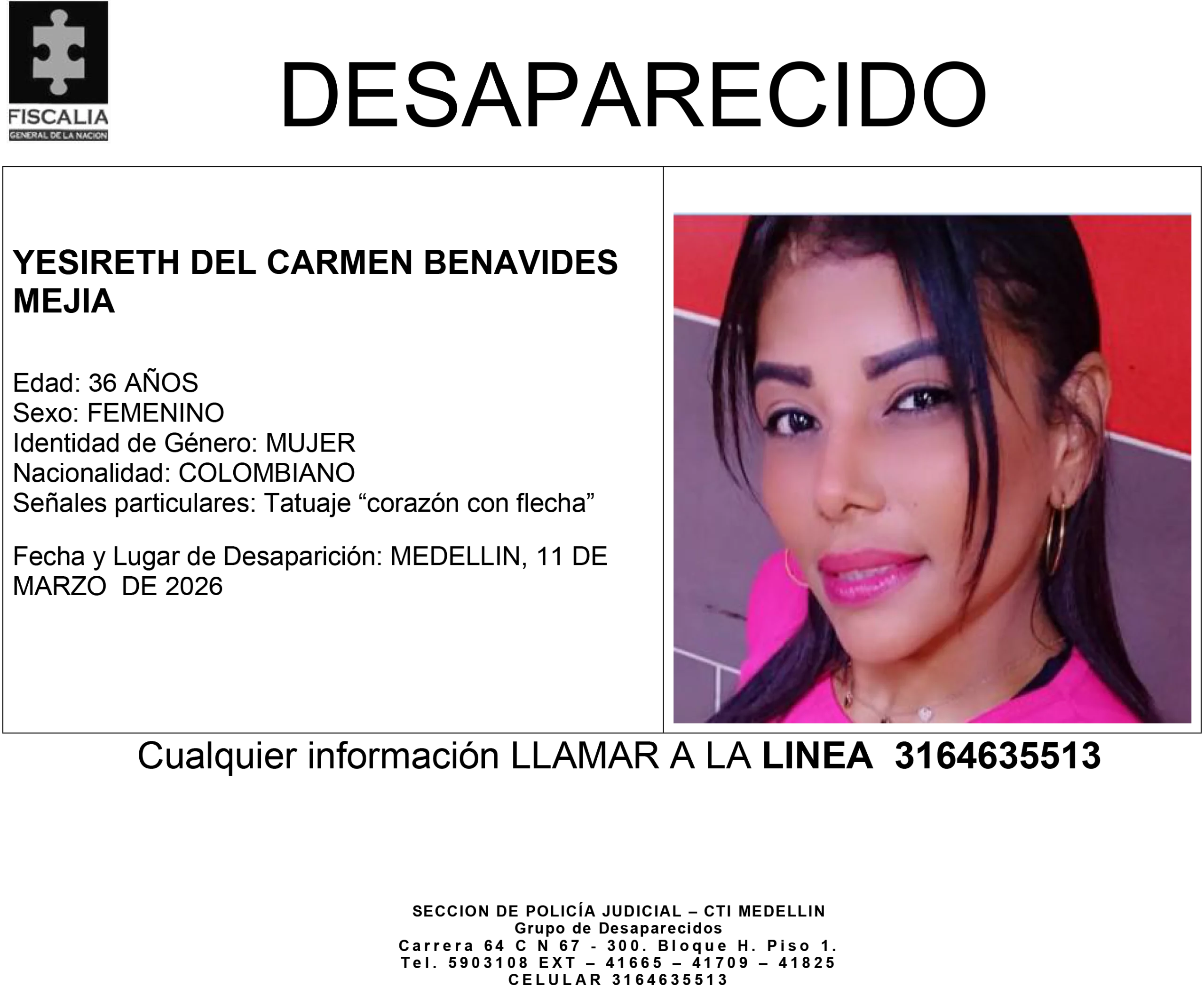 Yesireth del Carmen Benavides Mejía, de 36 años, es una mujer colombiana que presenta un tatuaje distintivo de un “corazón con flecha”.
