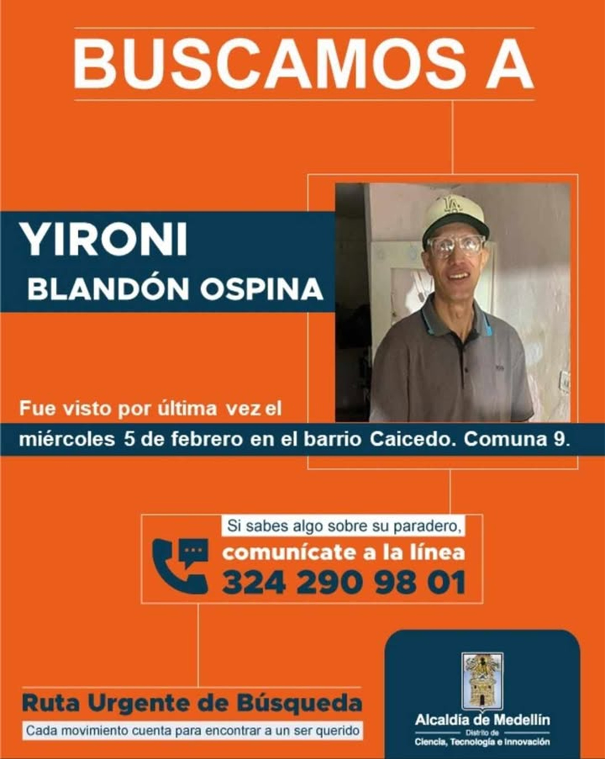 Resumen: Yironi Blandón Ospina fue visto por última vez el miércoles 5 de febrero en el barrio Caicedo, comuna 9.