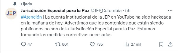 “La cuenta institucional de la JEP en YouTube ha sido hackeada en la mañana de hoy”, anunció la Jurisdicción este jueves, 21 de diciembre.