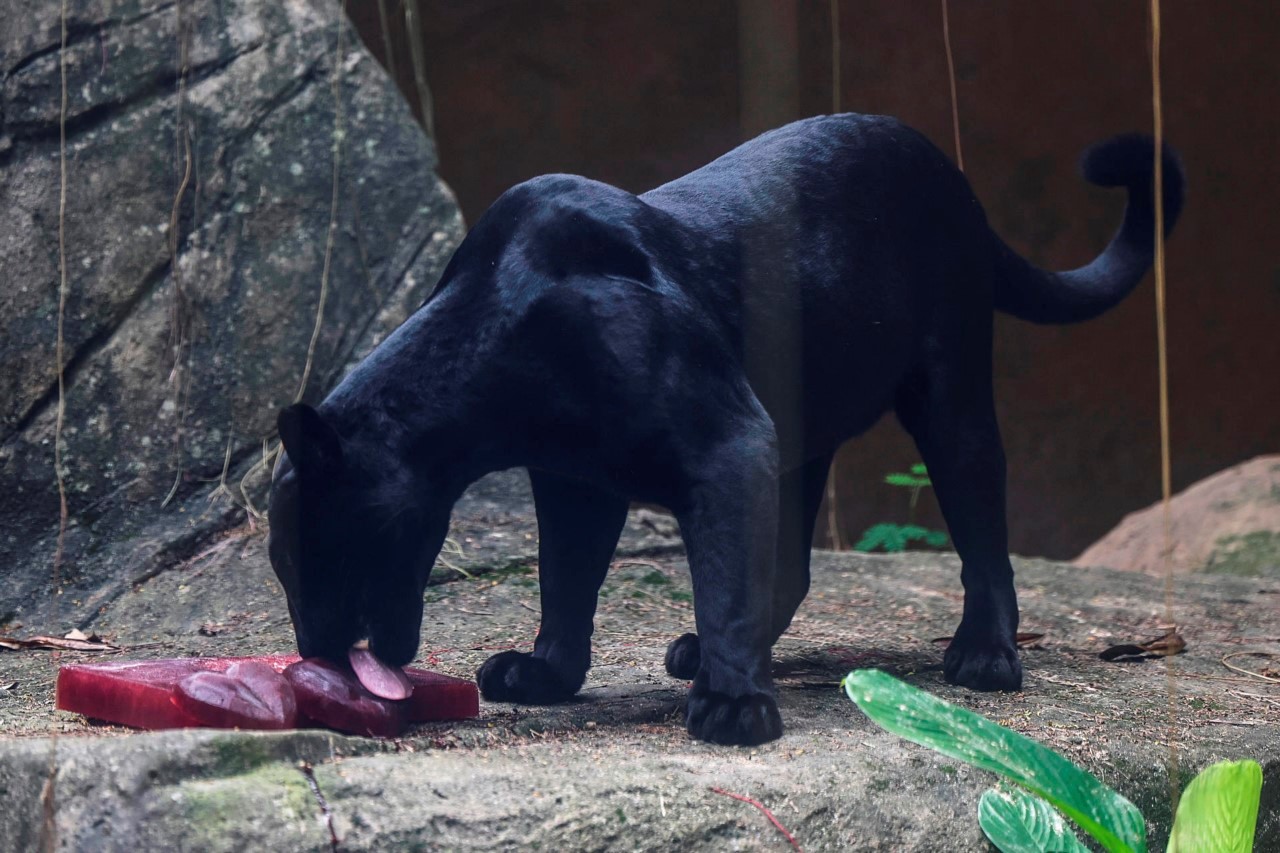 Un jaguar come un helado en el zoológico de Río de Janeiro (Brasil). El zoológico de Río de Janeiro decidió innovar en la dieta de varios de sus animales ante las elevadas temperaturas del actual verano austral y este viernes optó por ofrecerles helados de carne molida o de frutas, dependiendo del caso, para ayudarlos a amenizar el calor. EFE/Antonio Lacerda