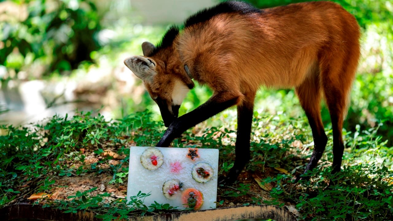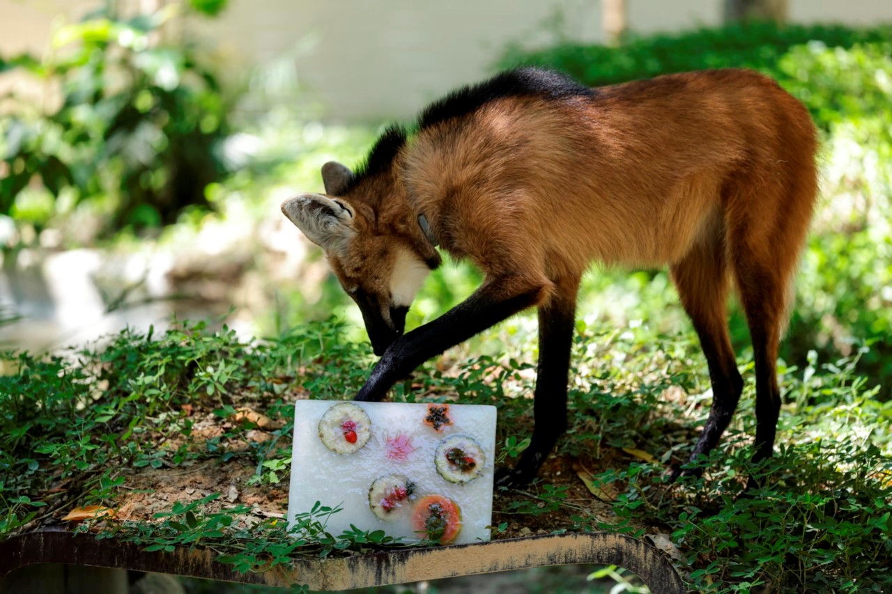 Un lobo guará come un helado en el zoológico de Río de Janeiro (Brasil). El zoológico de Río de Janeiro decidió innovar en la dieta de varios de sus animales ante las elevadas temperaturas del actual verano austral y este viernes optó por ofrecerles helados de carne molida o de frutas, dependiendo del caso, para ayudarlos a amenizar el calor. EFE/Antonio Lacerda